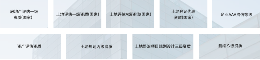 公司系中国房地产估价师与房地产经纪人学会常务理事单位、中国土地估价师与土地登记代理人协会会员单位、江苏省房地产估价与经纪协会会长单位、江苏省土地估价协会常务理事单位,现持有土地估价A级资信、房地产估价一级资质、国家级土地登记代理资质、国家甲级价格评估资质、乙级测绘资质、丙级土地规划机构评价资质、三级土地整治项目规划资质、资产评估资质,并入围了最高人民法院和江苏省高院房地产估价司法鉴定机构名录。